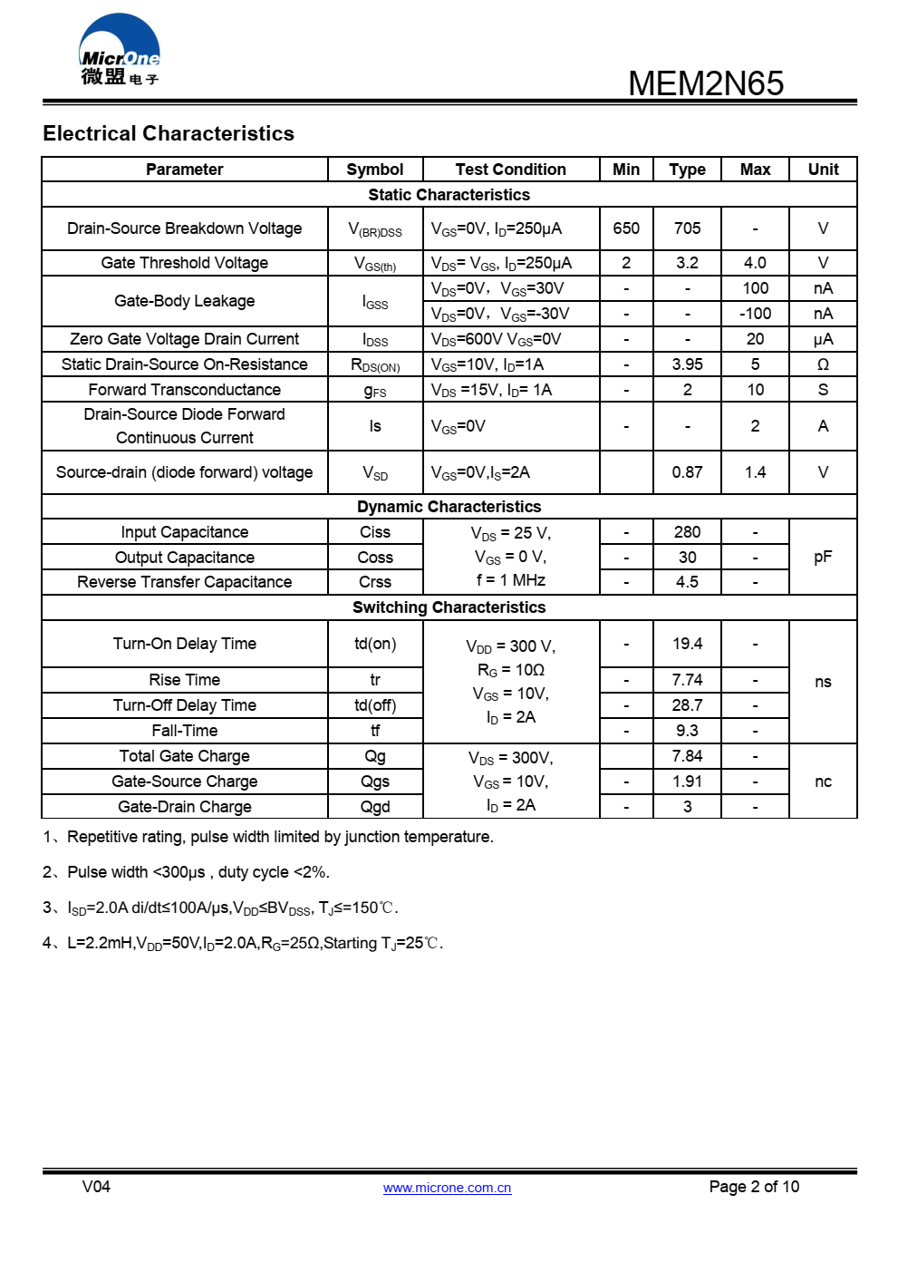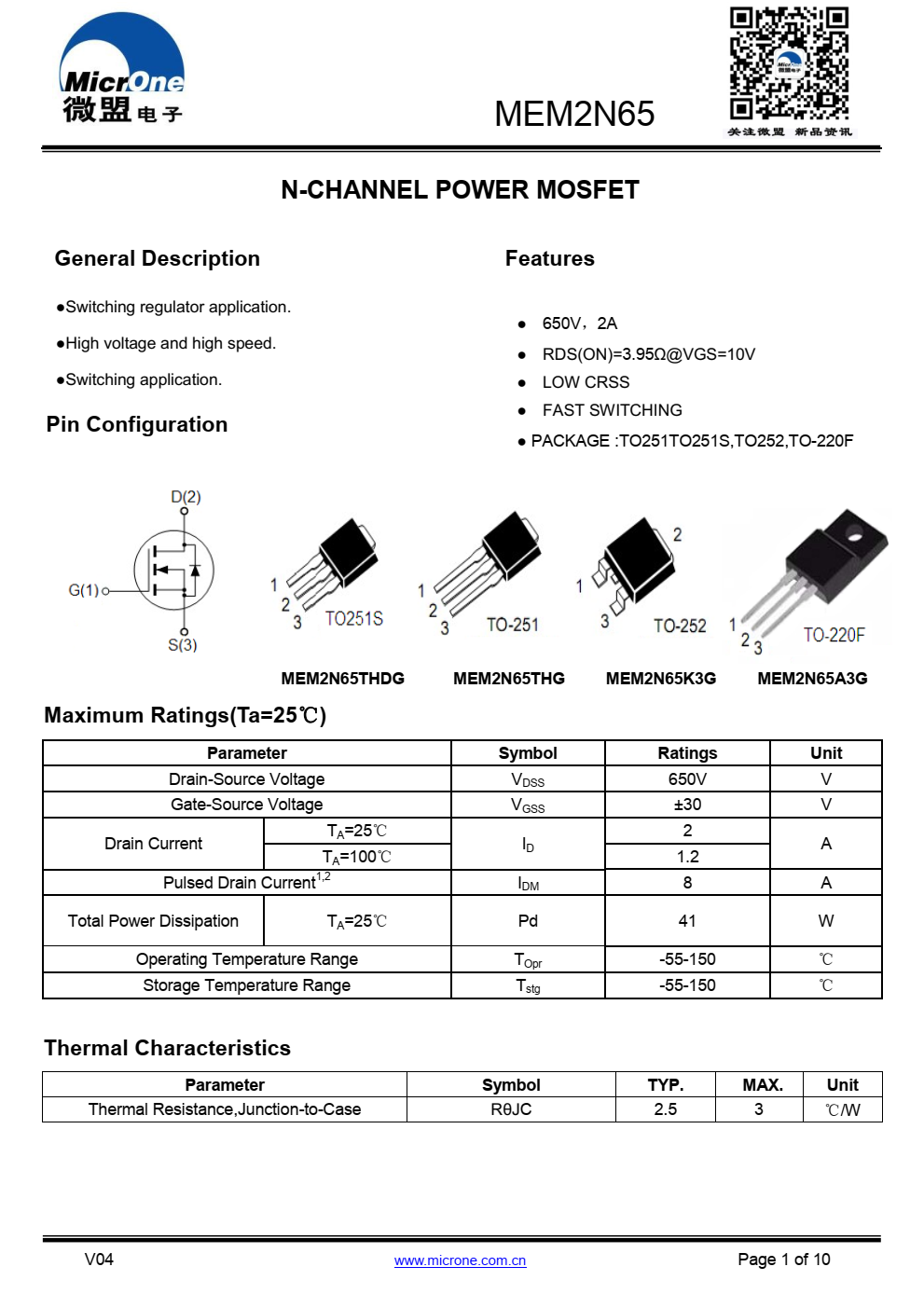 • MEM2N65 N沟道功率MOSFET