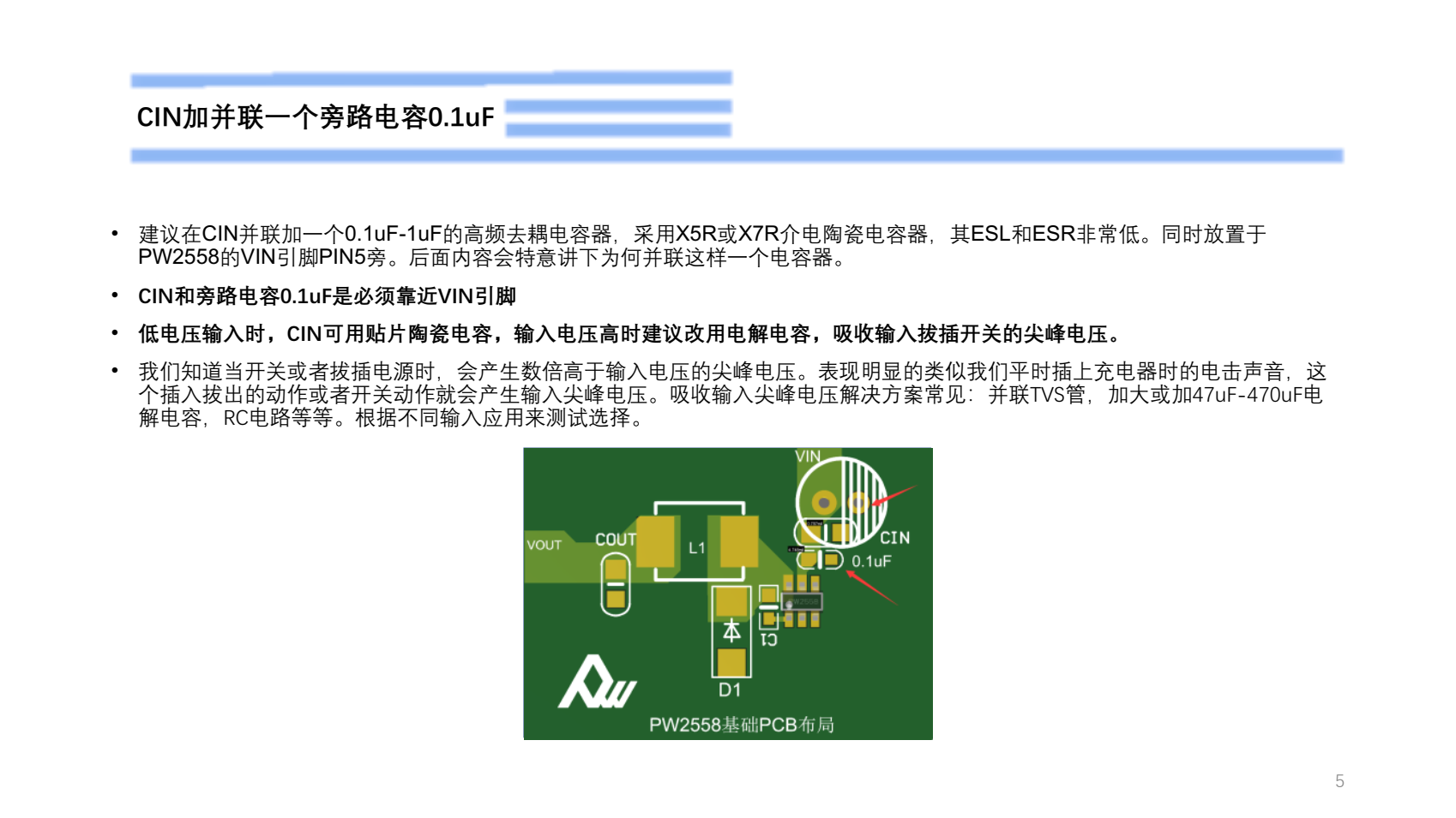 • CIN必须要靠近 PW2558的 VIN引脚 PIN5 ,不建议过孔背面放置。 COUT 在条件限制时,可过孔背面放置。