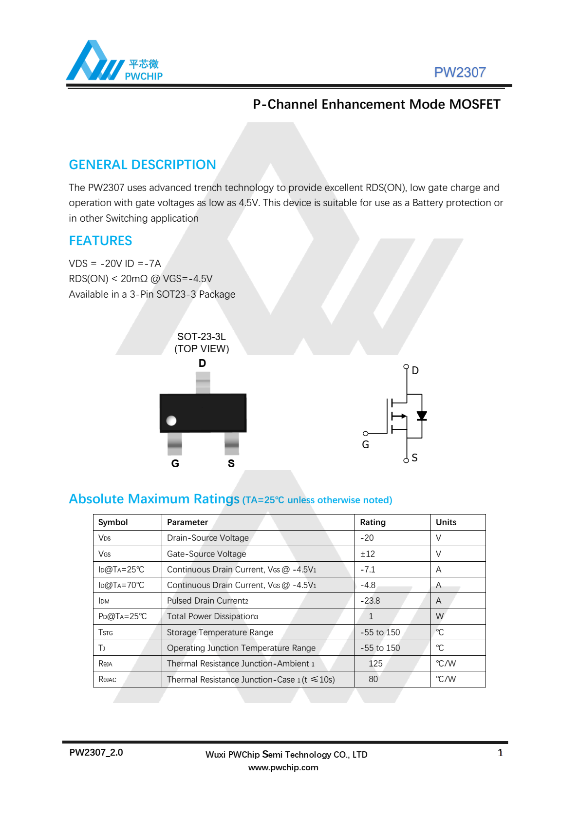 PW2307采用先进的沟槽技术,提供出色的RDS(ON)、低栅极电荷和