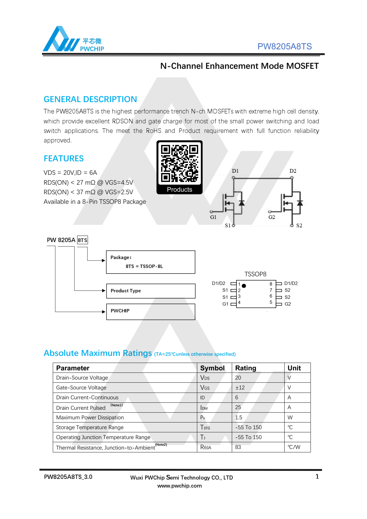 代理PW8205A8TS极高单元密度,高性能沟槽,全功能可靠性高